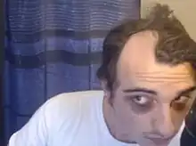 Raccoon eyes (also known in the United Kingdom and Ireland as panda eyes) or periorbital ecchymosis is a sign of basal skull fracture or subgaleal hematoma, a craniotomy that ruptured the meninges, or (rarely) certain cancers.[1][2] Bilateral hemorrhage occurs when damage at the time of a facial fracture tears the meninges and causes the venous sinuses to bleed into the arachnoid villi and the cranial sinuses. In lay terms, blood from skull fracture seeps into the soft tissue around the eyes. Raccoon eyes may be accompanied by Battle's sign, an ecchymosis behind the ear. These signs may be the only sign of a skull fracture, as it may not show on an X-ray. They normally appear between 48 and 72 hours after the injury.[3] It is recommended that the patient not blow their nose, cough vigorously, or strain to prevent further tearing of the meninges.[4]
