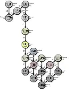 Radon-222 is generated in the uranium series from the alpha decay of radium-226, which has a half-life of 1600 years. Radon-222 itself alpha decays to polonium-218 with a half-life of approximately 3.82 days, making it the most stable isotope of radon.[1] Its final decay product is stable lead-206.