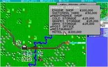Once the player builds a station they can build their first train (of the 32 permitted) at any engine shop. The player then can add cars to the train and send it on its way. The player can at any time change the consist, with options including mail and passenger cars as well as specialized freight cars for each of the game's nine other commodity types.