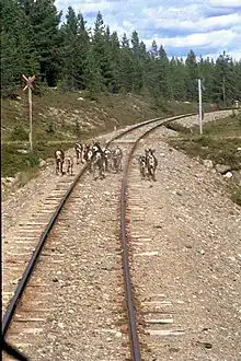 Some species are attracted by the railway to use it for feeding or as a transportation corridor. Omnivorous or granivorous species feed on grain that is spilled on the tracks by trains. Other species will eat vegetation near the train tracks, as this edge habitat usually contains vegetation that is different from the one located inside forests, farther away from the railway. Carcasses of animals previously killed on the railway can also attract scavengers.[8][3] Caribous have a higher chance of being preyed upon by wolves when located near linear infrastructures, of which railways are a part of. This indicates that wolves are likely using these railways to access prey more easily.[11][12]