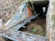 Structures already built into the railway infrastructure such as pipe culverts, box culverts, small access roads and bridges to cross rivers or valleys can offer safe passage underneath the railway for wildlife.[13] Culverts can be adapted during their construction or afterwards to better allow wildlife to use them as crossing structures by including dry ledges, modifying the habitat at the entrances, avoiding slopes or steps, etc.[13] Modifying culverts is likely the most economical solution to reduce the barrier effect.[14] Wildlife underpasses and overpasses are also good ways to reduce the barrier effect of railways, but they are associated with a much higher cost of construction.[13] These types of structures mainly help land animals, with birds and bats only being helped by extremely large structures.[13] The rock between two railway sleepers can be excavated to allow small mammals and herpetofauna who are unable to physically cross rails to do so.[3]