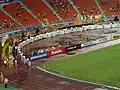 The aforementioned side tribunes are designated 'East' and 'West'. 'East' is the uncovered popular side; 'West' is the covered side where the more expensive seats are. The two ends are designated 'North' and 'South'. 'North' is the more popular of the two. It's where the more vocal and colorful elements of the Thai support congregate.
