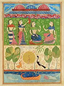 Pahari painting is a phenomenon a little later than its Rajasthani counterpart. First evidence of painting from the hill region is a manuscript of Devi Mahatmya (Him. State Mus.), almost certainly from the third quarter of the 16th century, which was painted in a style of the Caurapañcāśikā group.[65] The earliest court paintings from the Pahari state, done in a cohesive style very close to that practiced at the Mughal court between 1590 and 1630, were produced at Mandi, "a populous Hill court geographically occupying a large area in the lower portion of what is now Himachal Pradesh state".[66] Many of these paintings were perfected by hand of an artist called by Catherine Ann Glynn Early Master at the Court of Mandi (fl c. 1635–1660) or were made in his atelier. The Early Mandi Master, following Mughal influence, to traditional technique added subtle pastels and more naturalistic drawing to achieve more realistic figures and vegetation. The subject matter of Mandi painting was similar to those practised in Rajasthan - illustrations to sacred texts like Bhagavata Purana and Ramayana, Ragamalas and secular court subjects.[67]