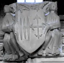 The ledger stone on top is missing its original monumental brasses, but the stonework of the chantry chapel retains several relief sculptures of heraldic escutcheons, some held by angels. Also shown is the heraldic badge of a ship's rudder, later adopted by Robert Willoughby, 1st Baron Willoughby de Broke (c. 1452 – 1502) (the eventual heir of Brooke) visible on his chest tomb in Callington Church in Cornwall.[16] Hamilton Rogers (1890) described the chantry chapel monument to Sir Ralph Cheney as follows:[17]