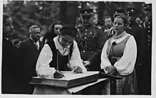 In 1928, for the 10th anniversary of the Act of Independence of Lithuania, Martynas Jankus decided to create a guestbook for those who visited Rambynas. Signing in the book became an integral part of the tradition during the interwar celebrations of Saint Jonas' Festival.[18] The book, known as the Eternal Book of Rambynas, is one of the largest in Lithuania. It measures 61.5 by 44 centimetres (24.2 in × 17.3 in) and is 10 centimetres (3.9 in) thick. It weighs 18.5 kilograms (41 lb) and is accompanied by a wooden case that weights another 10 kilograms (22 lb).[18] The covers are wood upholstered with leather and metal corners and close with two buckles. The second page is a portrait of Grand Duke Vytautas by Adomas Varnas.[18] The first comment was left by Vydūnas.[19] The visitors left notes and comments in Lithuanian, Latvian, Estonian, Russian, German, Finnish, Swedish, Norwegian, Japanese, Hindi.[18] The Japanese comments were left by Yotaro Sugimura, Assistant Secretary-General of the League of Nations.[13]