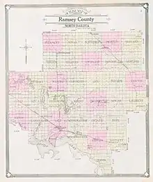 The Dakota Territory legislature created the county on January 4, 1873, with areas partitioned from Pembina County. The county was named for Alexander Ramsey, a U.S. Senator from Minnesota.[3] The county government was not completed at that time, and the county was not attached to another county for administrative or judicial purposes. This situation continued until January 25, 1883, when the county government was effected.