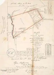 Alviso hired an American lawyer (previously a butcher) to survey his land, and the new borders of the rancho included much of Berreyesa's claim.[7] Alviso filed a claim for the grant with the Land Commission in 1852,[8] and the grant was patented to Alviso in 1871.[9]