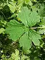 Ranunculus lanuginosus is herbaceous and perennial buttercup that can reach from 30 to 80 centimetres of height. It is usually an upright-growing and spread out plant that has stem with dense layer of trichomes. This species' stem is round and thick, as well as hollow. Its basal leaves have long leafstalk and are palmately lobed; with five segments being ovate and hirsute, while having double serrated margin. Upper stem leaves are sessile and palmately lobed, with wide segments.[2][4] In most cases leaves measure 12 centimetres in length and 8 centimetres in width.[2]