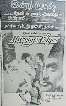 Ranuva Veeran (transl. Soldier) is a 1981 Indian Tamil-language action film directed by S. P. Muthuraman, starring Rajinikanth, Sridevi and Chiranjeevi. It was released on 27 October 1981 on the occasion of Diwali. The film was later dubbed in Hindi as Zulm Ki Zanjeer.[1] Despite starring two popular heroes from Tamil and Telugu cinema, Ranuva Veeran became a box office failure.[2]