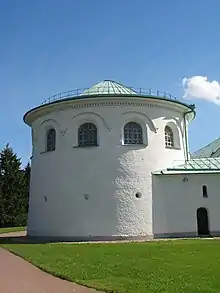 Ratnaya Palata (Russian: Ратная палата /rAht-naya pah-LAh-tah/ "Martial Chamber"[1]) is Russia's World War I museum[2] building in Pushkin town near Saint Petersburg, Russia. Designed for Romanov royal dynasty's 300th anniversary in Russian Revival architecture style together with the buildings of the church campus of the Sovereign's Cathedral of the Icon of Our Lady of Saint Theodore and the private royal railway terminal. Suggested, not long before World War I, to be built as a museum of Russian war history,[1] based on Elena Tretyakova's collection gift, the exhibition content, when the war was already under way in 1915,[1] was focused by Emperor Nicholas II on then current heroic deeds of Russian warriors, but the display, at first shown in the St Petersburg Admiralty building,[1] opened in Martial Chamber for only a short time before the end of Russian Empire in February 1917,[3] and was closed down a year later[3] by Soviet authorities. Having been used after that for unrelated purposes,[4] the Martial Chamber building was legally transferred to the Tsarskoye Selo Museum complex in 2008[1] and was cleared, restored, given a new collection of exhibits and reopened as modern Russia's first museum of World War I[2] by the centennial of its beginning in August 2014.[1] The exhibition is titled "Russia in the Great War" after a name for the war used at the time of its battles.[1]