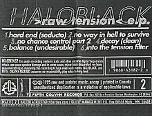 raw tension e.p. (stylized as >Raw Tension<) is an EP by haloblack, released on August 23, 1995, by Fifth Colvmn Records. It contains outtakes and remixes from the band's first two full-length Haloblack albums, Tension Filter and funkyhell. Intended to be pressed on compact disc in 1995 with its six songs contained in one continuous track, the EP was instead issued on cassette with an additional seventh track and te songs separated.[1] On March 7, 2001, the CD-R version was released with original intended track listing intact on digital format.[2]