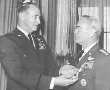 His military decorations include the Distinguished Service Medal, Legion of Merit, Army Commendation Medal with oak leaf cluster and Air Force Outstanding Unit Award Ribbon with oak leaf cluster.