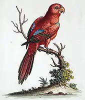 In 1751 the English naturalist George Edwards included an illustration and a description of the red lory in the fourth volume of his A Natural History of Uncommon Birds. He used the English name "The long-tailed scarlet lory". Edwards based his hand-coloured etching on a stuffed specimen that he had purchased from a toyshop in London. He was uncertain of its origin. Edward gave his specimen to the collector Hans Sloane and subsequently a visitor to Sloane's house suggested that the bird may have come from Borneo.[2] When in 1758 the Swedish naturalist Carl Linnaeus updated his Systema Naturae for the tenth edition, he placed the red lory with the other parrots in the genus Psittacus. Linnaeus included a brief description, coined the binomial name Psittacus borneus and cited Edwards' work.[3] The red lory is now one of six species placed in the genus Eos that was introduced by the German naturalist Johann Georg Wagler in 1832.[4][5] The genus name is from the Ancient Greek eōs meaning "dawn". The specific epithet borneus, bornea is a toponym from Borneo. This is an error as the species does not occur on the island.[6]