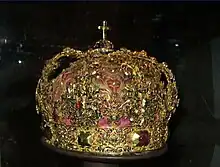The Crown of Eric XIV,[1] made in Stockholm in 1561 by Flemish goldsmith Cornelius ver Welden, is typical of the Renaissance style of jewelry of his time. Originally his crown bore four pairs of the letter 'E' and 'R', the initials of the Latin form of his name, "Ericus Rex", in green enamel, each pair being on either side of the central stones on the front, sides and back of the circlet. When he was deposed by his brother, John III, John had each of these letters covered with identical cartouches each set with two pearls. The Swedish monarchs of the Houses of Palatinate-Zweibrücken, of Hesse and of Holstein-Gottorp preferred to use Queen Christina's crown rather than that of Eric XIV; however, the House of Bernadotte chose to use Eric's crown. However, they replaced the original monde and cross at the top of the crown with a new large monde enameled blue with gold star and set with diamond and with a cross of ten diamonds. They also replaced the original pearls on the top of the eight large ornaments on the circlet with diamonds and replacing the pearl cartouches with eight diamond rosettes, and moved the circlet 45 degrees. This is the form the crown has in the portrait of Oscar II painted by Oscar Björck. In the early twentieth century this monde and cross and these diamond rosettes were removed and the crown restored to essentially the form it had under John III.[2]