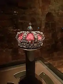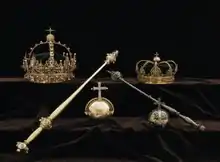 The burial crowns, sceptres and orbs of King Carl IX and his Queen Christina have been kept at Strängnäs Cathedral. Such items are originally interred with the bodies but later have often been exhumed and put on display.[3] On 31 July 2018 thieves stole the crowns and one orb and escaped on a speedboat.[4] The lost regalia were found on 5 February 2019 in Åkersberga, Österåker municipality.[5]