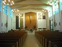 The chapel is built of stone on the exterior, as is the rest of the school, and has a wood finish inside. The altar is made of granite stone. Along the entire chapel are stained glass windows, and images featuring the Stations of the Cross. To either side of the cross are long fabric drapes displaying the school's colors of blue and gold. Behind those drapes are the pipes for the school's $200,000 organ.