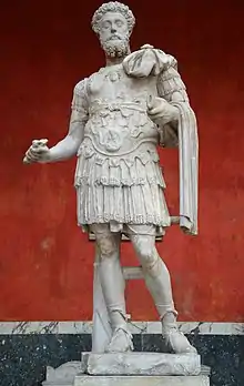 Fronto sent Marcus a selection of reading material, and, to settle his unease over the course of the war, a long and considered letter, full of historical references.[73] In modern editions of Fronto's works, it is labeled De bello Parthico (On the Parthian War). There had been reverses in Rome's past, Fronto writes, but, in the end, Romans had always prevailed over their enemies: "always and everywhere [Mars] has changed our troubles into successes and our terrors into triumphs".[74][75]