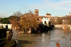 Pius' funeral ceremonies were, in the words of the biographer of the Historia Augusta, "elaborate".[21] If his funeral followed the pattern of past funerals, his body would have been incinerated on a pyre at the Campus Martius, while his spirit would rise to the gods' home in the heavens. Marcus and Lucius nominated their father for deification. In contrast to their behavior during Pius' campaign to deify Hadrian, the senate did not oppose the emperors' wishes. A flamen, or cultic priest, was appointed to minister the cult of the deified Pius, now Divus Antoninus. Pius' remains were laid to rest in Hadrian's mausoleum, beside the remains of Marcus' children and of Hadrian himself.[22] The temple Pius had dedicated to his wife, Diva Faustina, became the Temple of Antoninus and Faustina. It survives as the church of San Lorenzo in Miranda.[20]