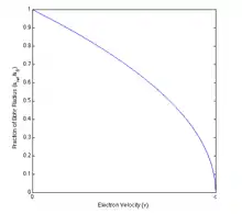 At right, the above ratio of the relativistic and nonrelativistic Bohr radii has been plotted as a function of the electron velocity. Notice how the relativistic model shows the radius decreases with increasing velocity.