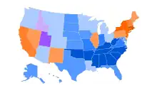 The strength of various sects varies greatly in different regions of the country, with rural parts of the South having many evangelicals but very few Catholics (except Louisiana and the Gulf Coast, and from among the Hispanic community, both of which consist mainly of Catholics), while urbanized areas of the north Atlantic states and Great Lakes, as well as many industrial and mining towns, are heavily Catholic, though still quite mixed, especially due to the heavily Protestant African-American communities. In 1990, nearly 72% of the population of Utah was Mormon, as well as 26% of neighboring Idaho.[106] Lutheranism is most prominent in the Upper Midwest, with North Dakota having the highest percentage of Lutherans (35% according to a 2001 survey).[107]