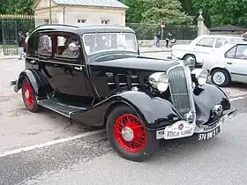 Then wheelbase length was not materially changed, but there was now only a single body type offered, and the decision had evidently been taken to position the Vivasport as a cut-price route to 6-cylinder performance motoring.[3] The body in question was a 4-door "Berline sans malle" (saloon/sedan without a boot/trunk hatch).[3] The steel body was no less aerodynamic than before, but it lacked embellishment, and there was no sign of the fashionable "spats" that covered the top halves of the rear wheels on other 6-cylinder Renault saloons/sedans at this time.[3] In October 1936 the "Berline" bodied Vivasport "Type BCT1" was very aggressively priced at 26,900 francs.[3] The heavy hitters in terms of market volume, Peugeot and Citroën, still did not compete at this level of the market while the domestic auto-makers producing cars in the same tax bracket, notably Delage and Hotchkiss, were pricing their products at much higher levels. A new contender had appeared, however, as a result of the Matford partnership between Mathis and Ford. The "new" V8 power Matford V8-76 (in effect a locally adapted and assembled Ford V8) featured in the 21CV car tax band, offered a claimed maximum power output of 90hp and was listed with a "Berline" (saloon/sedan) body at 33,900 francs.[4]