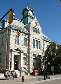 The Renfrew Post Office, built in 1908, is located at 249 Raglan Street South. Built in the Romanesque Revival style with exterior walls of irregularly coursed split-faced stone and mansard roof clad in seamed copper, this beautiful edifice is a major landmark on Renfrew's main throughfare. The tapered silhouette of the metal-clad clock tower, hipped gable roof and weather vane tops the stone structure that has twinned principal entrances with metal coats of arms located above. Located below the top centre window is the engraving E.R. 1908, representing the monarch at the time of construction. The interior consists of hardwood finishes, terrazzo tile floors, plaster ceilings and walls with wood dados. Over the years, the building has shared use of the post office, customs and revenue offices, and the NHA/NHL Birthplace Museum. In 2018, the building was sold by the town to Rob Thompson Hotels Ltd. for the price tag of $100,000 with the proposal of a boutique hotel in the upper levels of the building, while retaining the post office on the main level and numerous conditions to keep the historical features intact.