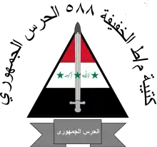 The Iraqi Republican Guard (Arabic: حرس العراق الجمهوري, romanized: Ḥaras al-ʿIrāq al-Jamhūrīy) was a branch of the Iraqi military from 1969 to 2003, which existed primarily during the presidency of Saddam Hussein. It later became known as the Republican Guard Corps, and then the Republican Guard Forces Command (RGFC) with its expansion into two corps. The Republican Guard was disbanded in 2003 after the invasion of Iraq by a U.S.-led international coalition.
