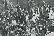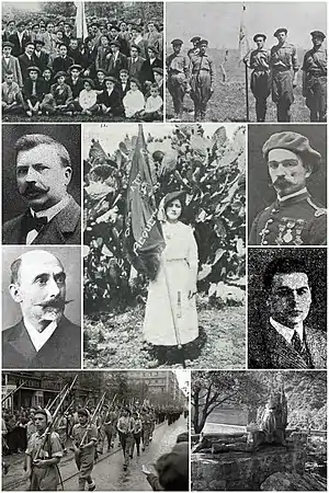 The first Carlist youth formations started to emerge in the early 1900s, but their origins are highly unclear. Groups named Batallones de la Juventud were recorded in Madrid (1902) and Barcelona (1903) when staging marches and parades, apparently intended to demonstrate prowess of Traditionalism and perhaps also to intimidate political enemies.[7] Some scholars see these initiatives not as part of freshly born political mobilization among the urban youth, but rather as continuation of the old Carlist "tradition of direct action". They claim that "abortive resumption of violence at the turn of the century" – i.e. a series of minor disturbances, staged mostly in Catalonia in 1900 – as their important consequence produced loose "armed squads of Carlists", which engaged in petty urban violence during the following years.[8] These gangs were easily suppressed by forces of order, yet their emergence demonstrated a new phenomenon: mostly urban Carlist militancy, independent of official movement structures and oriented towards street violence.