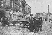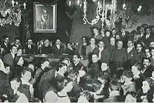 Slightly ahead of the Great War the Requeté activity assumed a visibly pro-German and anti-French tone. When the president of France Raymond Poincaré travelled by train to Madrid, in Catalonia he was greeted with "¡Viva España y Alemania!" paintings, signed by Requeté.[171] During the hostilities, when the question of Spanish stand versus the conflict remained a heated political issue, requeté militants provided protection to rallies advancing either neutralist (effectively pro-German) or openly pro-German and pro-Austrian narrative.[172] During a popular feast in Barcelona they assaulted participants who carried cartoons mocking the Kaiser[173] and in 1917 some politicians already suggested that the organization was actually financed by Germany;[174] as there has never been a shadow of evidence unearthed, the claim was most likely entirely unsubstantiated.