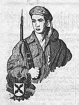 Exact origins of requeté organisation are not clear. In the early 1900s loose Carlist groups in Catalonia referred to themselves as "requeté",[12] a name that dates back to the crack battalion of Navarre in the First Carlist War, distinguished by general Zumalacarregui for their gallantry.[13] Also some correspondents of Traditionalist press used the term as their pen-name.[14] It seems that first attempts to create a Carlism-flavored framework for juvenile and youth activities were related to the city of Manresa. In 1907 a local review Lo Mestre Titas was referred to as "portavoz del requeté escolar"[15] and present-day scholars also consider it an unofficial mouthpiece of local juvenile Carlism.[16] Historians often repeat a theory that the first organization named "Requeté" was set up in Manresa in 1907 by a 37-year-old publisher and propagandist Juan María Roma.[17] The first press reference is dated 1908, it points to "Requeté Carlí de Manresa" and does not mention Roma.[18] The principal objective of the organisation was defined as "fem propaganda", and called "joves carlins de Catalunya" to follow suit.[19] Indeed, soon groupings from other locations like Sabadell[20] or Girona[21] notified setup of their own requeté branches.