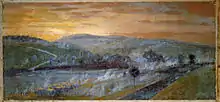 The Battle of Monterey Pass began as Brig. Gen. Judson Kilpatrick's cavalry division arrived near Fairfield on July 4 just before dark. They easily brushed aside Brig. Gen. Beverly Robertson's pickets and encountered a detachment of 20 men from the Confederate 1st Maryland Cavalry Battalion, under Capt. G. M. Emack, that was guarding the road to Monterey Pass. Aided by a detachment of the 4th North Carolina Cavalry and a single cannon, the Marylanders delayed the advance of 4,500 Union cavalrymen until well after midnight. Kilpatrick was not able to see anything in the dark and considered his command to be in "a perilous situation." He ordered Brig. Gen. George A. Custer to charge the Confederates with the 6th Michigan Cavalry, which broke the deadlock and allowed Kilpatrick's men to reach and attack the wagon train. They captured or destroyed numerous wagons and captured 1,360 prisoners—primarily wounded men in ambulances—and a large number of horses and mules.[18]