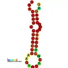 Stem loop 1 (SL1) (also referred to as HIV-1_DIS) consists of a conserved hairpin structure with a palindromic loop sequence which was predicted and confirmed by mutagenesis.[13] This palindromic loop is known as the primary dimer initiation site (DIS) as it is believed to promote dimerization of the viral genome through formation of a "kissing dimer" intermediate.[14] The Rfam structure shown is based on a covariation model.