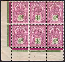 Some British revenue stamps were also overprinted for use in the colonies. Impressed duty stamps were overprinted for use in the protectorate of Cyprus.[61] Embossed adhesives were overprinted for use in Barbados,[62] the British Solomon Islands,[63] Jamaica[64] and Trinidad and Tobago.[65] British key types were also overprinted for use as postage and revenue stamps of British Bechuanaland,[66] as revenue stamps of Cyprus[67] and Weihaiwei,[68] and as court fee stamps of the Trucial States.[69] The key types were also used to produce Military Telegraphs and Army Telegraphs stamps of the United Kingdom.[70] British postage and revenue stamps were also overprinted for use as revenues in Mandatory Palestine.[61][71]