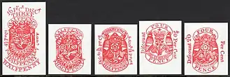 A wide range of large-format stamps were issued to pay for Medicine Duty. These were affixed directly to jars or packets of medicine, and many different types exist, both standard issues as well as appropriated ones with the manufacturer's brand specified on the stamp. Medicine duty stamps were first introduced in 1783 and remained in use until 1941.[33] In 1915, two King George V postage and revenue stamps were overprinted to pay for additional medicine duty. This was done after duty rates had doubled, and the stamps were affixed over large-format stamps with the old face values.[34]