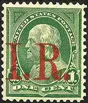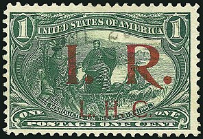 On June 13, 1898, Congress passed the War Revenue Act of 1898 to provide badly needed funding for the Spanish–American War. The law was to become effective on July 1, 1898, leaving only seventeen days to produce the badly needed revenue stamps. In anticipation of the law's passage the Bureau of Engraving and Printing had already commenced work on the dies and printing plates for the new revenue stamps, however they were unable to issue the stamps when the law went into effect. To meet the demand for revenue stamps, existing stocks of standard postage stamps (issued in 1895–1898) were overprinted with the initials I.R. (i.e., Internal Revenue) for use as revenue stamps. Initials are faint on issues with denominations of 8, 10 and 15-cents.[23]