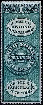 The second issue of revenue stamps were Documentary stamps and issued in 1871. After the Internal Revenue received many reports of the fraudulent re-use of revenue stamps, typically with cancellation ink washed or otherwise removed from the face of the stamp,[13] a letter of May 31, 1867 from government officials in Wall Street was sent to Internal Revenue commissioner E.A. Rollins expressing the concern that "The U.S. government loses thousands of dollars daily by stamps being used a second time." The ordinary stamps in use at this time did not receive the cancellation ink very well, unless it was heavily applied.[14] The letter advised that all stamps be printed in a pale yellow color. This particular suggestion however was not taken up by Butler & Carpenter, but instead, after a period of experimentation, they responded to the problem by producing stamps of a lighter shade and on a paper that more readily absorbed cancellation ink.[14] The Internal revenue was frequently sending stamps suspected of having cancellation ink washed to the engravers and printers for inspection to determine if they had been tampered with.[15]