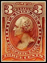 The new stamps were printed in several colors and depicted a portrait of George Washington on all thirty denominations from one-cent to $200.[6] The engraved image of Washington was modeled after a painting by Gilbert Stuart.[7] The first issues were printed on hard brittle paper and later printed on soft woven paper of varying thicknesses. Colors were generally dull for stamps printed before 1868. The stamps were issued in sheets perforated with 12 gauge perforations or 'imperforate', i.e.solid sheets with no perforations.[5] Washington remained the only figure on the dozens of varieties issued up until 1874.[8]