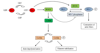 Different substrates can be phosphorylated by ROCKs, including LIM kinase, myosin light chain (MLC) and MLC phosphatase. These substrates, once phosphorylated, regulate actin filament organization and contractility as follows:[2]