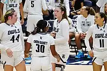 Members of the Rice Owls women's basketball team during a game at Tudor Fieldhouse in 2023