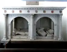 Richard Bampfield's monument, erected in 1604 by his son Amias Bampfield, survives in the south transept of Poltimore Church. It comprises two recumbent stone effigies, of Richard Bampfield and his wife, under a low canopy supported by arched openings and columns.[16] A view of the monument is obstructed by pews in front and by the balcony above forming the manorial pew of the Bampfield family. The 8 painted escutcheons on the cornice depict the arms of 5 of his 8 sons-in-law, each impaling Bampfield, and the 3 sons-in-law of his son and heir Sir Amias Bampfylde, each impaling Bampfield.