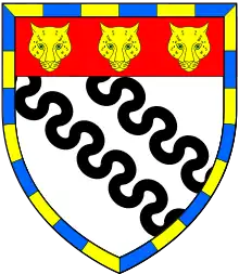 Arms of Richard Clement: Argent, two bendlets wavy sable on a chief gules three leopard's faces or a bordure compony or and azure[1]