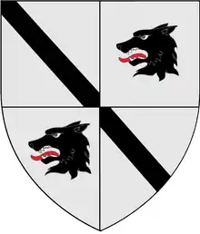 ![]() Arms of Hough: Quarterly 1 and 4 Argent, a bend Sable, 2 and 3 Argent, a wolf's head, erased, Sable | |
