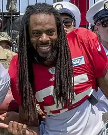 Richard Kevin Sherman[1] (born March 30, 1988) is a former American football cornerback who played 11 seasons in the NFL. Sherman played college football at Stanford, beginning his career as a wide receiver before moving to cornerback as a junior.[2] He was drafted by the Seattle Seahawks in the fifth round of the 2011 NFL Draft. He was selected to the Pro Bowl five times and voted All-Pro five times, including three times to the first team, and led the NFL in interceptions in 2013, when he also helped the Seahawks win their first Super Bowl. Sherman is regarded as one of the greatest cornerbacks of all time.[3][4]