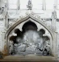 Sir Richard was also buried in Exeter Cathedral, near his brother the bishop, against the north wall across the north ambulatory from the bishop's tomb. His tomb is marked by an elaborate monument comprising a recessed ogee shaped niche set into the wall, containing his recumbent effigy, in the form of a cross-legged knight, which style supposedly represents crusaders. At the effigy's head stands a small statue of a man and at the feet a horse with an even smaller statue of a man holding its reins. According to Prince (d. 1723)[17] this last group refers to the tradition of the cripple who seised the foreleg of Sir Richard's horse at Cripplegate and thereby threw him off his horse into the hands of the murderous mob. It is however more likely that the figures are "a touching early fourteenth century visual representation of the Knight with his immediate following ... a knight is shown accompanied by his squire, page and horse".[18] The Devon historian Sir William Pole (d. 1635) stated that the arms of Stapledon (Argent, two bends wavy sable) were displayed on the shield of the effigy,[19] but today no trace of colour remains. These arms are however still visible (possibly restored) on the nearby monument to his brother the bishop.