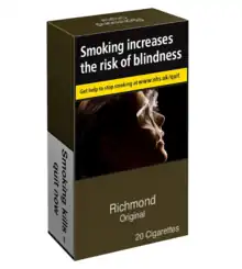 Richmond's variants Superkings and King Size are the fourth and fifth top-selling brand of cigarettes in the UK respectively.[5] They were characterised by the bright blue packaging, which in early 2006 underwent a redesign: the serif font used being replaced for a more modern sans-serif, and general appearance becoming more minimalist.[6] However, since 20 May 2016, none of these colours have been manufactured on the packets due to plain tobacco packaging laws coming into force, excepting the Channel Islands, as of 31 July 2022; along with a local ban on menthol cigarettes.