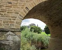 The Richmond Bridge is constructed of sandstone quarried from Butchers Hill, hauled to the construction site by convicts using hand carts. It consists of four main arches, of span 4.3, 8.1, 8.3, 8.5, 8.3 and 4.1 metres (14.1, 26.6, 27.2, 27.9, 27.2, and 13.5 ft), respectively, which spring from sloping fins with angular leading edges aligned with the flow of to the lake.