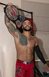 On September 11 at Way of the Ronin 2011, Ricochet and Cima defeated Masato Yoshino and Pac to win the Open the United Gate Championship in a match, where Ricochet's and Cima's Open the Twin Gate Championship was also on the line.[61] After the merger of Evolve and Dragon Gate USA, Ricochet took part in the final official professional wrestling match in the Asylum Arena, when he unsuccessfully challenged Johnny Gargano for the Open the Freedom Gate Championship at an Evolve event on January 14, 2012.[62] On March 30, Ricochet and Cima were forced to vacate the Open the United Gate Championship, after Cima was sidelined with a neck injury. In the main event of the evening, Ricochet teamed with Masato Yoshino to defeat Chuck Taylor and Johnny Gargano and regain the Open the United Gate Championship.[63] On June 21, Ricochet and Yoshino were stripped of the title due to Yoshino being unable to appear at the following month's Dragon Gate USA events.[64] On July 29, Ricochet teamed with Rich Swann in a match to determine the new Open the United Gate Champions. They were, however, defeated in the match by Cima and AR Fox.[65] On November 2 at Fearless 2012, Ricochet was defeated by Fox in a Respect match and, as a result, was forced to tell his opponent that he respected him.[66] Two days later at Freedom Fight 2012, Ricochet unsuccessfully challenged Johnny Gargano for the Open the Freedom Gate Championship in a four-way elimination match, which also included Akira Tozawa and A. R. Fox.[67] On April 4, 2014, Ricochet defeated Gargano to win the Open the Freedom Gate Championship.[68] On November 16, 2014, during Dragon Gate USA's parent company WWNLive's tour of China, Ricochet lost the title back to Gargano.[69]