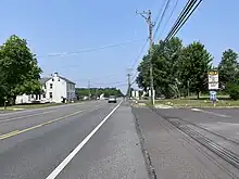 At an intersection with Evergreen Road/Rupert Road on the border of Lower Pottsgrove Township and Limerick Township, the road changes names from East High Street to Ridge Pike. From this intersection, Ridge Pike heads east into Limerick Township as a four-lane undivided road. The road comes to a westbound exit and eastbound entrance that connects to Evergreen Road and an interchange with the US 422 freeway. From here, Ridge Pike continues east as a four-lane undivided road through commercial areas, narrowing to two lanes as it passes to the north of Heritage Field Airport. The road gains a center left-turn lane as it heads through a mix of homes and businesses with some fields, curving to the southeast. Ridge Pike becomes a four-lane undivided road as it continues southeast, turning back into a three-lane road with a center left-turn lane. The road heads past businesses as it runs through the community of Limerick and intersects Swamp Pike, where it narrows to two lanes and runs past homes. Ridge Pike gains a center left-turn lane as it continues southeast through residential and commercial development and some farmland and woodland. The roadway loses the center turn lane and becomes four lanes as it passes businesses and comes to an intersection with Township Line Road, at which point it heads into Upper Providence Township. Here, the name of the road becomes West Main Street as it turns into a three-lane road with a center left-turn lane and runs through residential areas.[3][5]