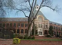 The campus includes one central building, which, along with the original gym, was completed in 1919 at a total cost of $285,000 (equivalent to $4.8 million in 2022). The building features brick walls, a slate roof and other stone features.[5] The building was planned to be opened at an earlier date but it was postponed because of World War I.[6] The building was designed by the architectural firm of Tracy and Swartwout, which also designed the Missouri State Capitol building.[7]