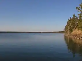 During the last ice age most of the vegetation in the Riding Mountain region was eliminated, and it remained this way after the retreat of the glaciers 12,500 years ago.[30] The Riding Mountain upland and surrounding plains and Manitoba Escarpment were mostly carved in the Tertiary era, but the ice sheets of the Pleistocene period modified the drainage and appearance of the land.[28] Only the movement of the last ice sheet in this period left a visible effect on the features of the region.[28] About 11,500 years ago a spruce dominated forest began to emerge in its place, with some of the vegetation being ash, juniper, sedges, buffaloberry, and trembling aspen.[30] After this time the climate was dry, and the percentage of spruce decreased.[30] During the Holocene climatic optimum up until 6500 years ago the amount of herbs, shrubs and grasses in the park increased. At the end of this time beaked hazelnut appeared and the amount of bur oak increased, with the climate becoming cooler and moister.[30] Up to 2,500 years ago the amount of grassland species in general decreased and boreal forests migrated into the Riding Mountain region. It was at this moment that ecosystems began to resemble those of today, with species such as tamarack, fir, alder, pine and spruce becoming more common.[30] Several streams that run through the park have headwaters in Riding Mountain's lakes.[28] Clear Lake's water comes from underground springs rather than from streams.[28]